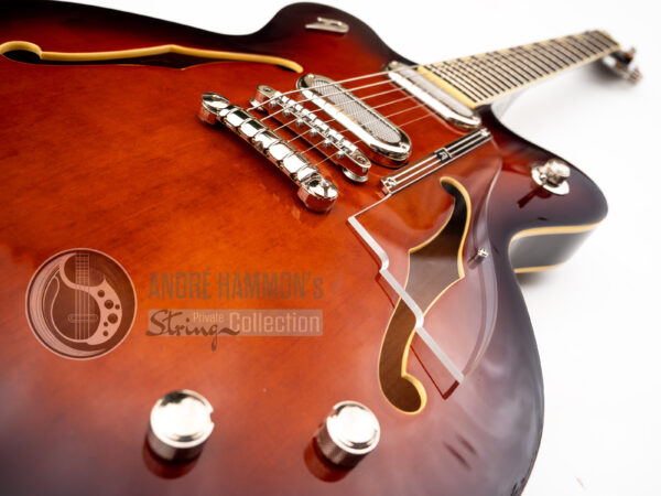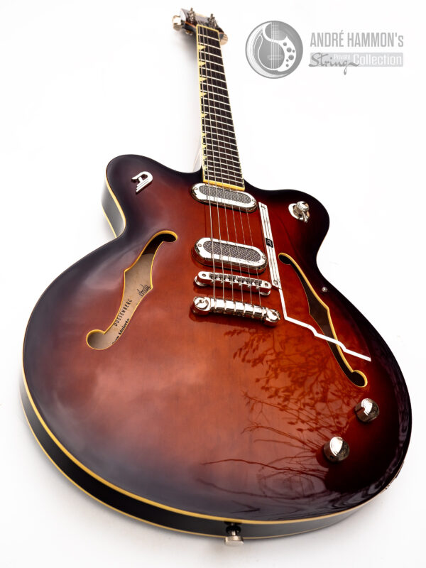 Der elegante 4-Wege-Pickup-Schalter, der am vorderen Cutaway sitzt, gibt Dir zum einen die übliche Humbucker/P90-Kombination, zum anderen aber auch die bekannte Duesenberg-Position, in der Bassanteile aus dem Sound für einen hellen, perlenden Klang gezielt herausgefiltert werden.