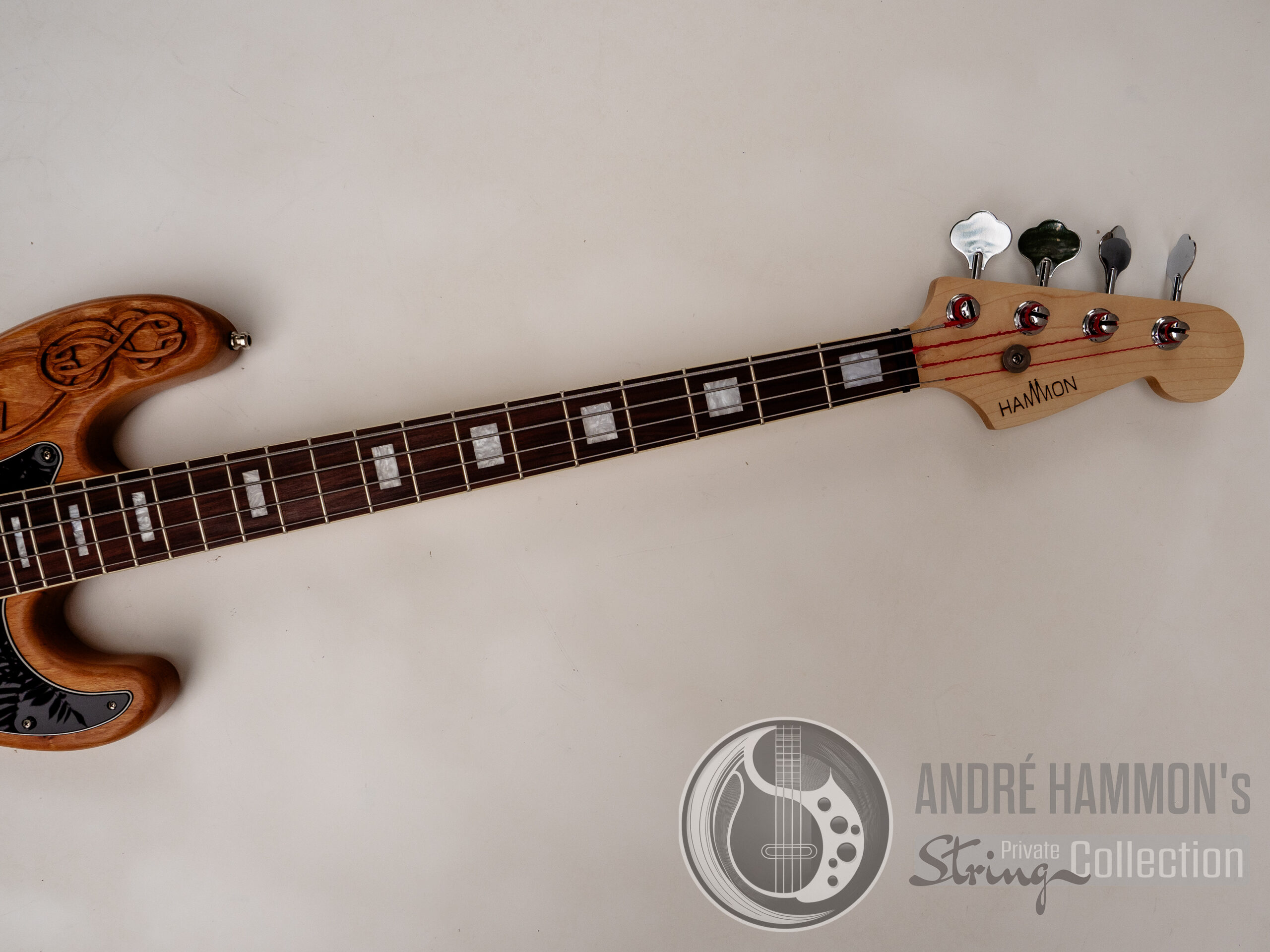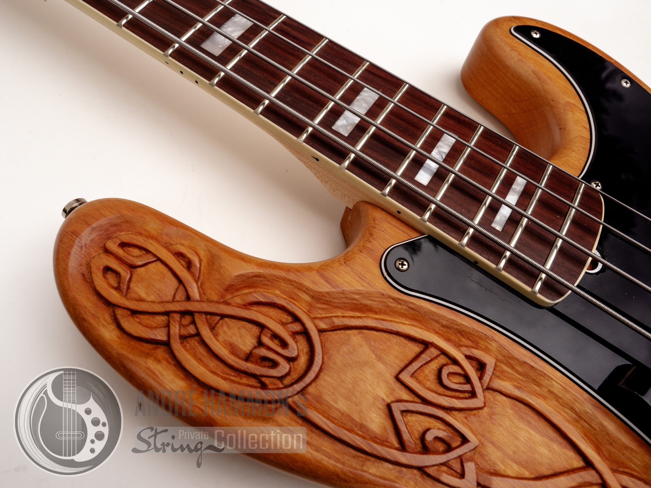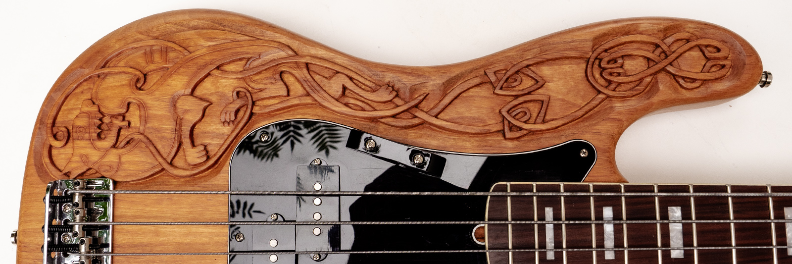Für die Anbringung keltischer Motive war die Holzdesignerin Petra Landes von mir beauftrag worden, die dieses Celticmotiv in vielen Stunden Handarbeit auf den Body brachte. Die Arbeit ist exzellent filigran, auch wenn so etwas als Handarbeit nicht gerade günstig in der Herstellung ist. Dafür ist dieser Basskörper wirklich sehr individuell und es gibt mit Sicherheit keinen zweiten davon.